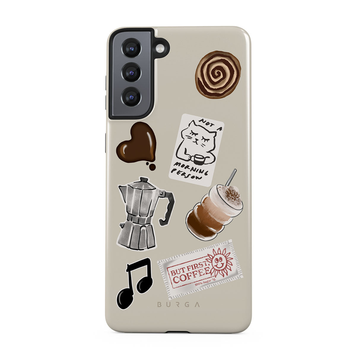 En este diseño: cafetera moka, frappé, rollo de canela, corazón de chocolate, sticker "Not a morning person", ticket "But First, Coffee", nota musical.