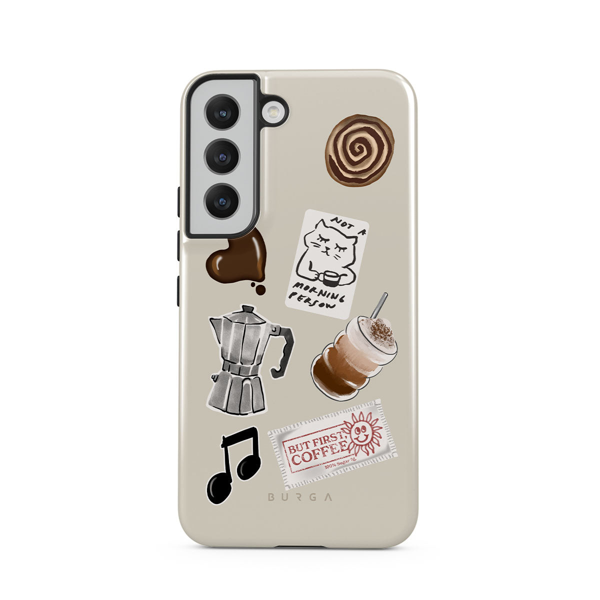 En este diseño: cafetera moka, frappé, rollo de canela, corazón de chocolate, sticker "Not a morning person", ticket "But First, Coffee", nota musical.