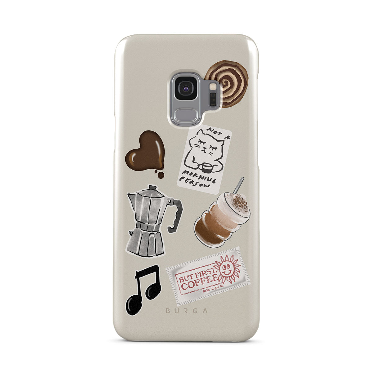 En este diseño: cafetera moka, frappé, rollo de canela, corazón de chocolate, sticker "Not a morning person", ticket "But First, Coffee", nota musical.