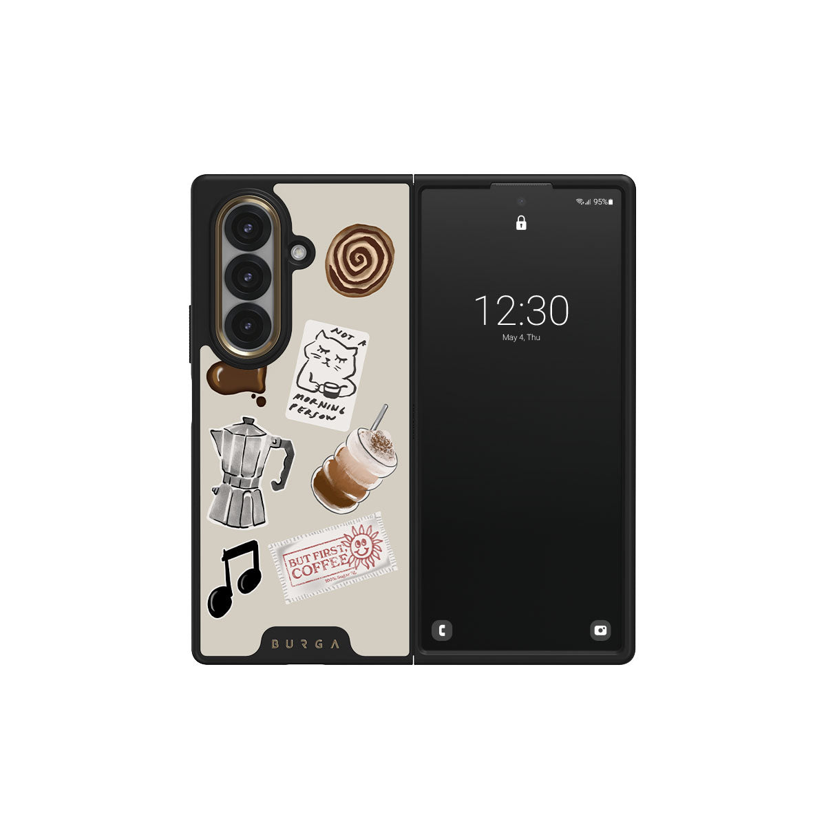 En este diseño: cafetera moka, frappé, rollo de canela, corazón de chocolate, sticker "Not a morning person", ticket "But First, Coffee", nota musical.