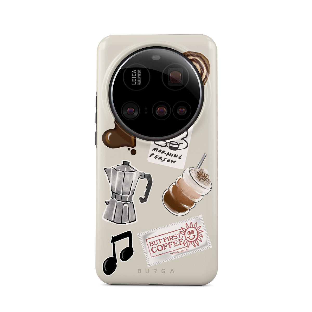 En este diseño: cafetera moka, frappé, rollo de canela, corazón de chocolate, sticker "Not a morning person", ticket "But First, Coffee", nota musical.