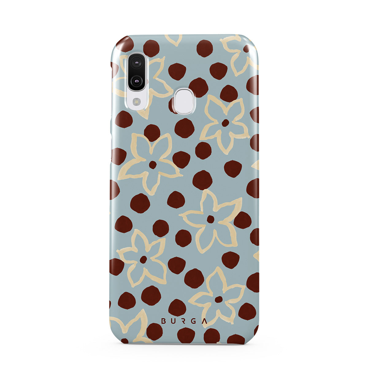 En este diseño: flores, patrón de puntos, fondo azul claro