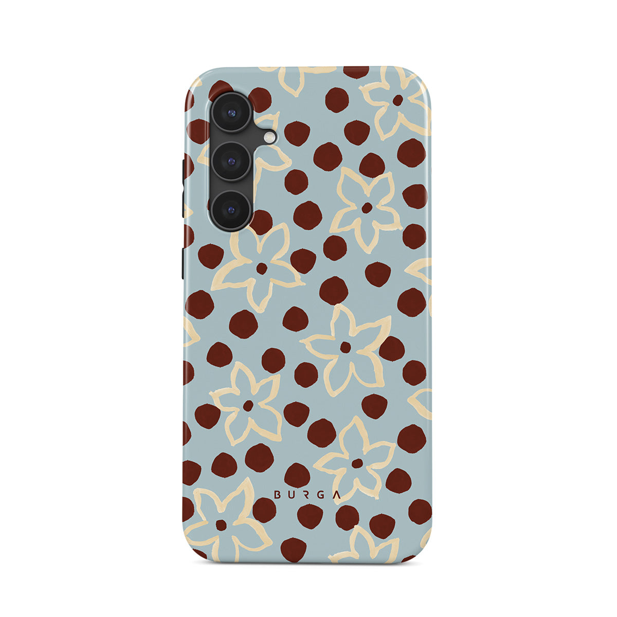 En este diseño: flores, patrón de puntos, fondo azul claro