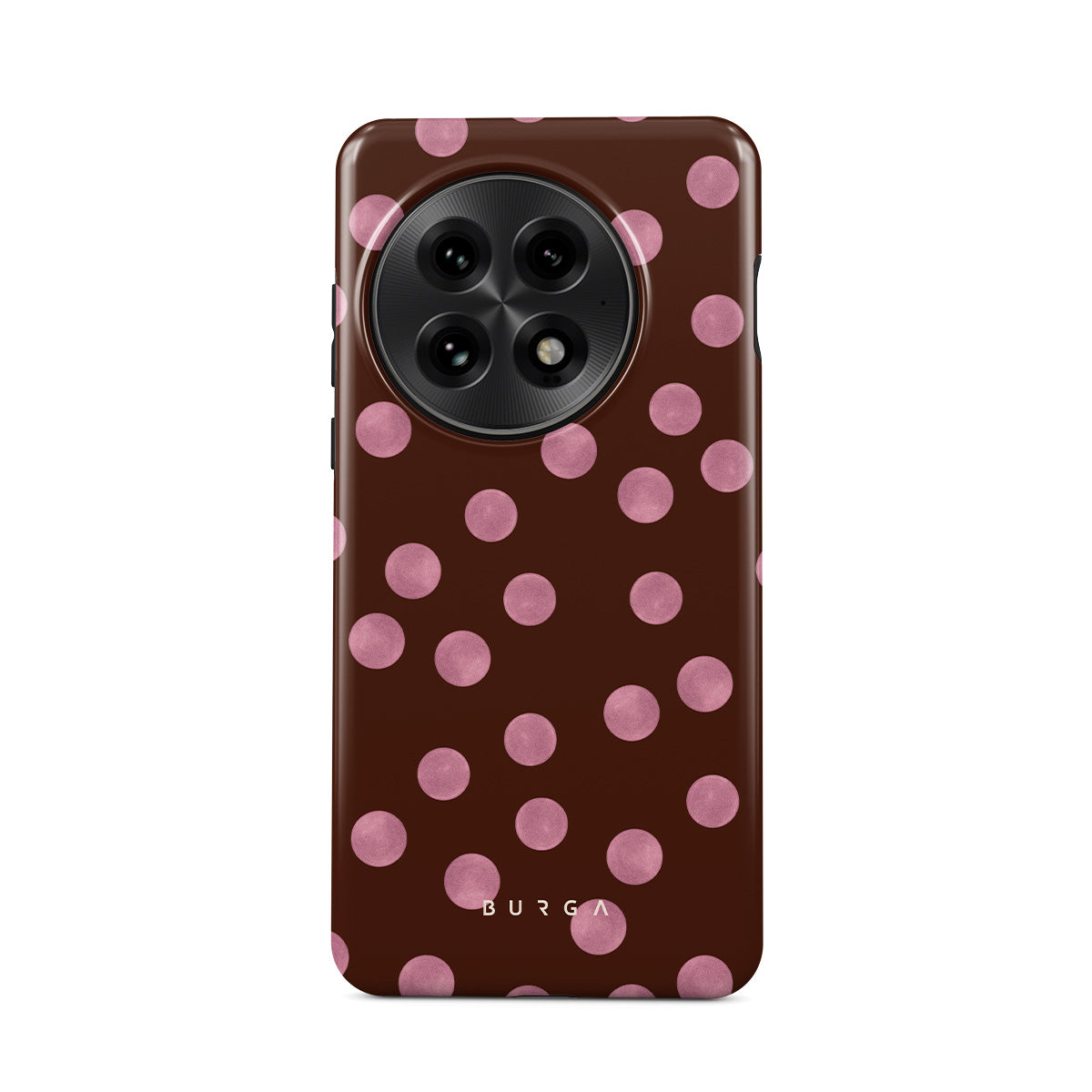 En este diseño: lunares rosas, fondo marrón, estampado de puntos