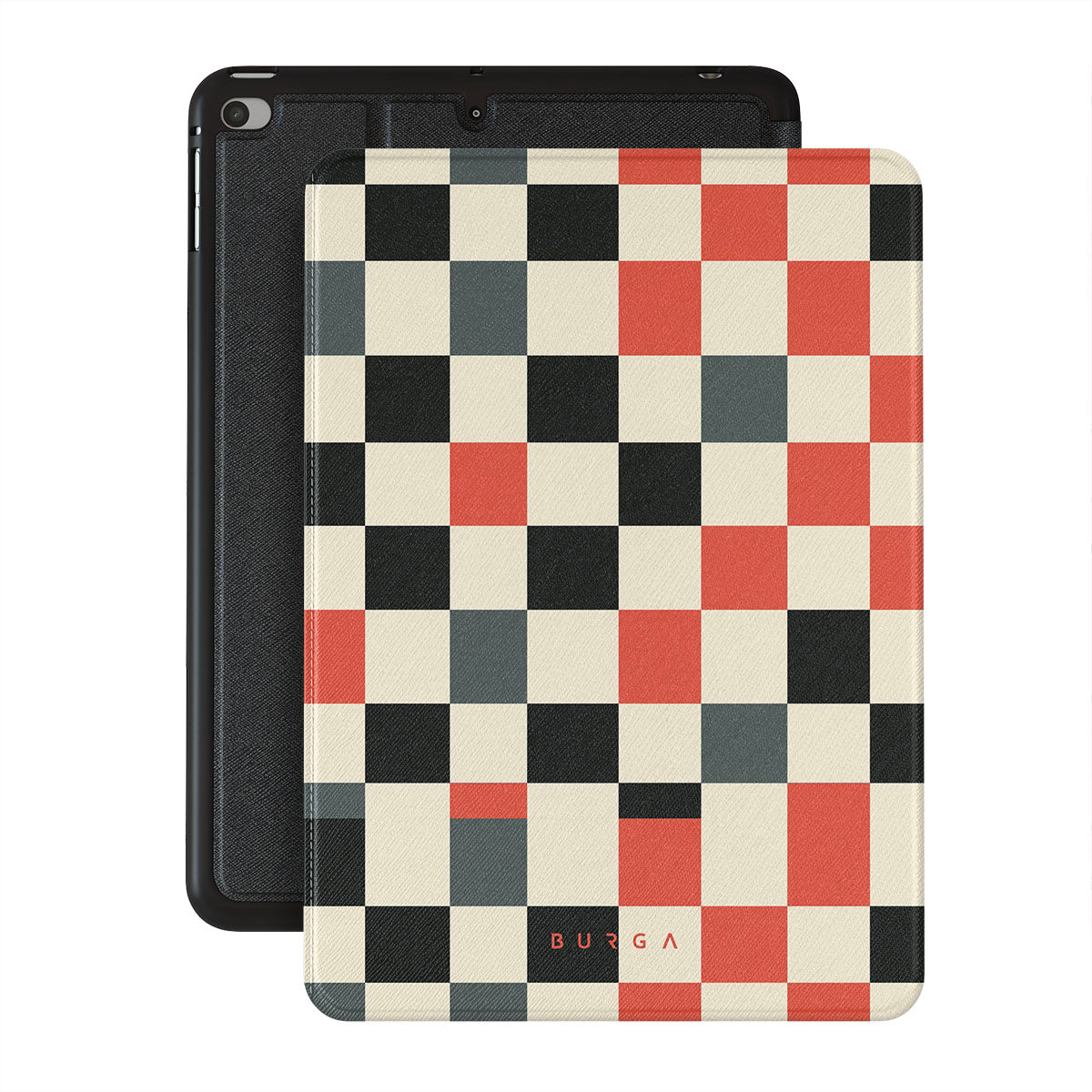 En este diseño: patrón de cuadros, naranja, negro, gris, blanco y patrón geométrico