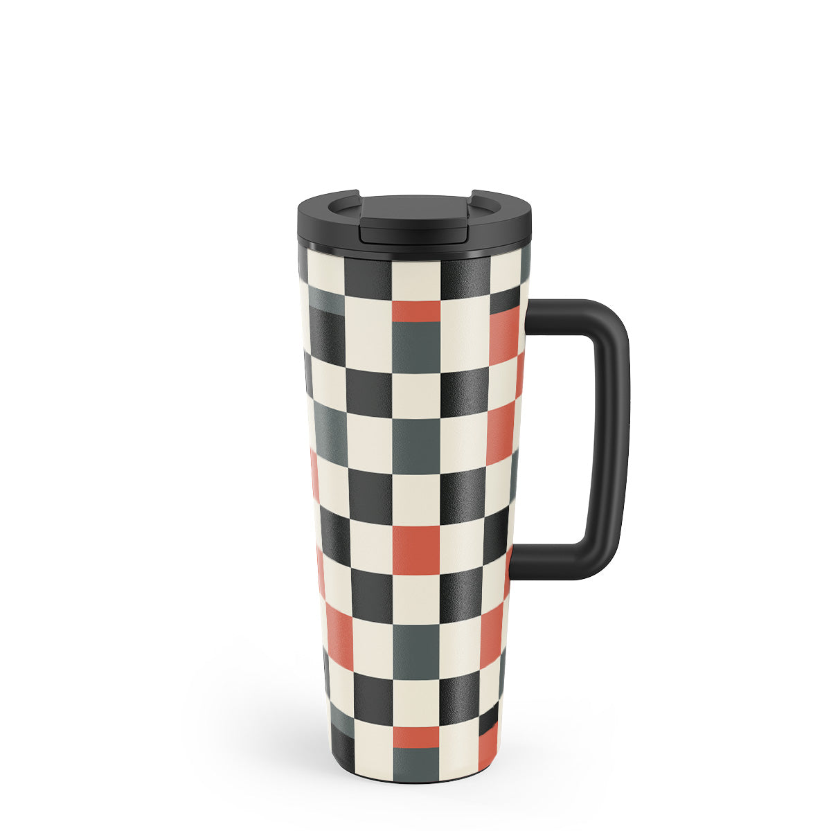 En este diseño: patrón de cuadros, naranja, negro, gris, blanco y patrón geométrico