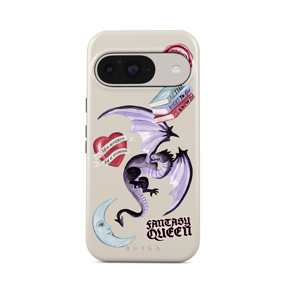 En este diseño: dragón morado, sticker "Fantasy Queen", luna creciente, sello de cera morado, corazón con mensaje, libros.