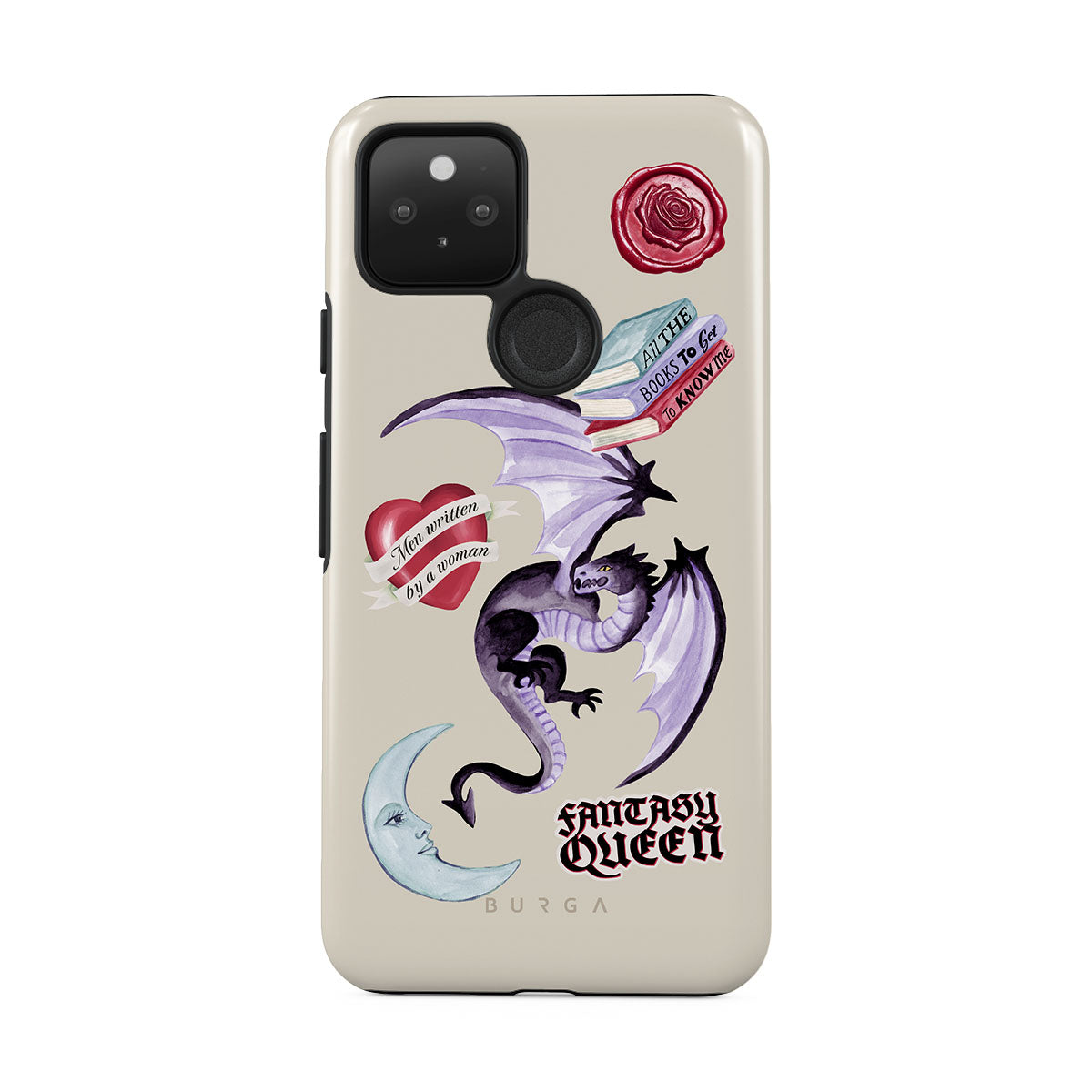 En este diseño: dragón morado, sticker "Fantasy Queen", luna creciente, sello de cera morado, corazón con mensaje, libros.