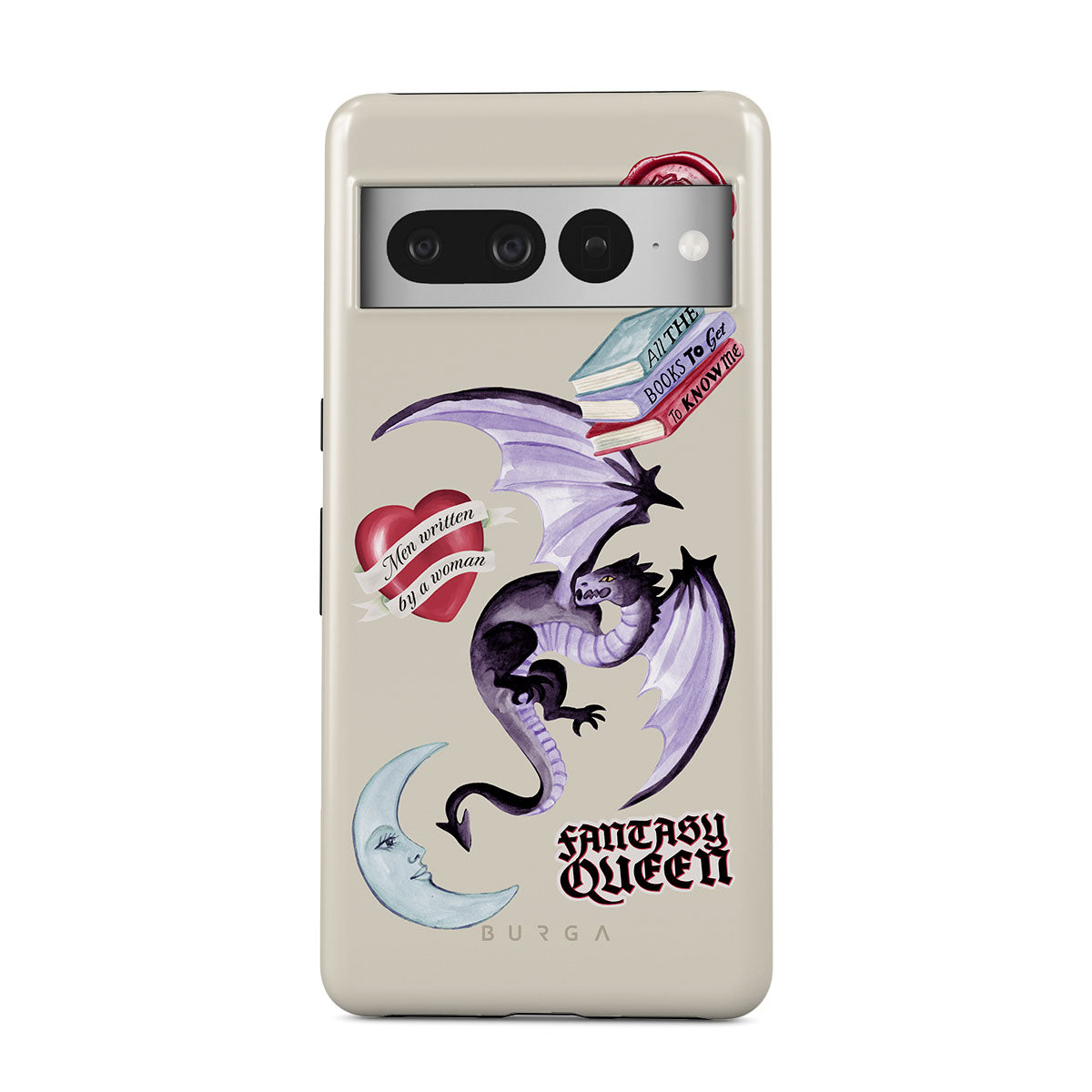 En este diseño: dragón morado, sticker "Fantasy Queen", luna creciente, sello de cera morado, corazón con mensaje, libros.