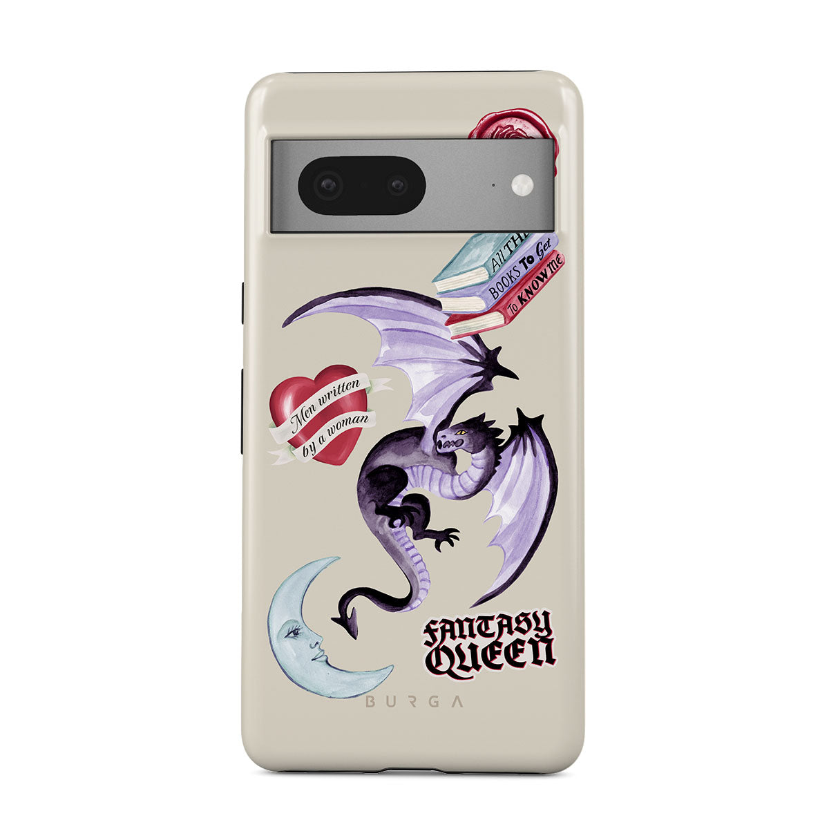 En este diseño: dragón morado, sticker "Fantasy Queen", luna creciente, sello de cera morado, corazón con mensaje, libros.