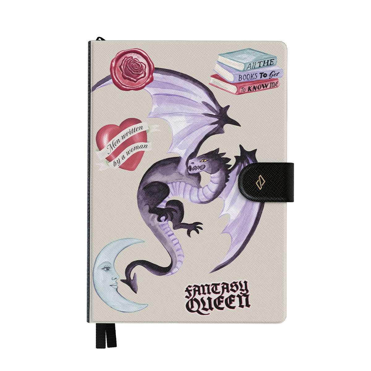 En este diseño: dragón morado, sticker "Fantasy Queen", luna creciente, sello de cera morado, corazón con mensaje, libros.