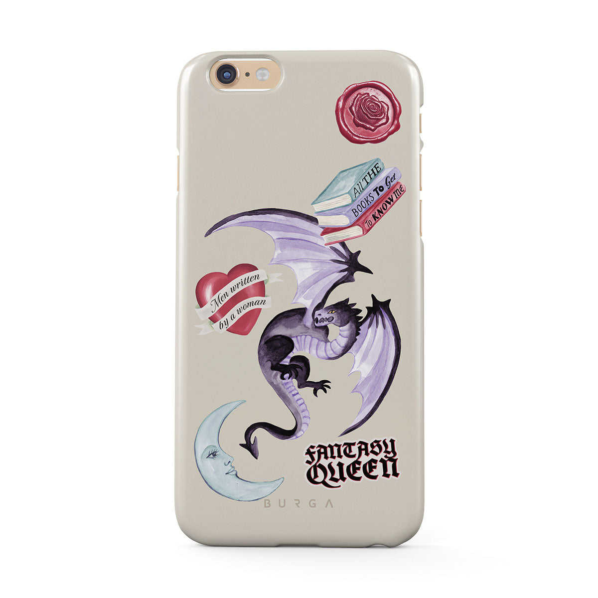 En este diseño: dragón morado, sticker "Fantasy Queen", luna creciente, sello de cera morado, corazón con mensaje, libros.