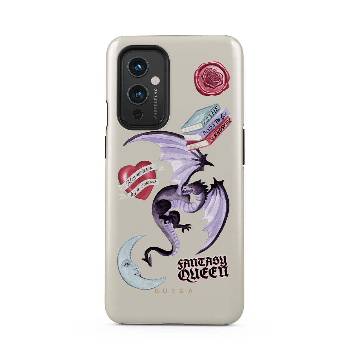 En este diseño: dragón morado, sticker "Fantasy Queen", luna creciente, sello de cera morado, corazón con mensaje, libros.