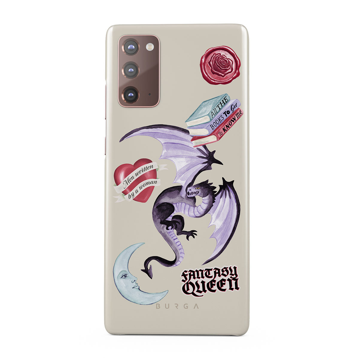 En este diseño: dragón morado, sticker "Fantasy Queen", luna creciente, sello de cera morado, corazón con mensaje, libros.