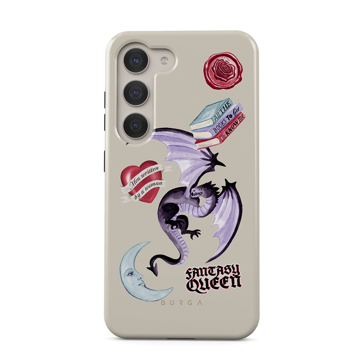 En este diseño: dragón morado, sticker "Fantasy Queen", luna creciente, sello de cera morado, corazón con mensaje, libros.