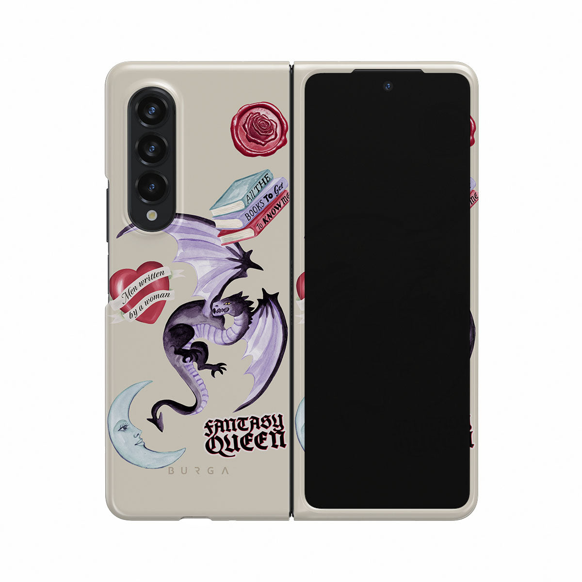 En este diseño: dragón morado, sticker "Fantasy Queen", luna creciente, sello de cera morado, corazón con mensaje, libros.