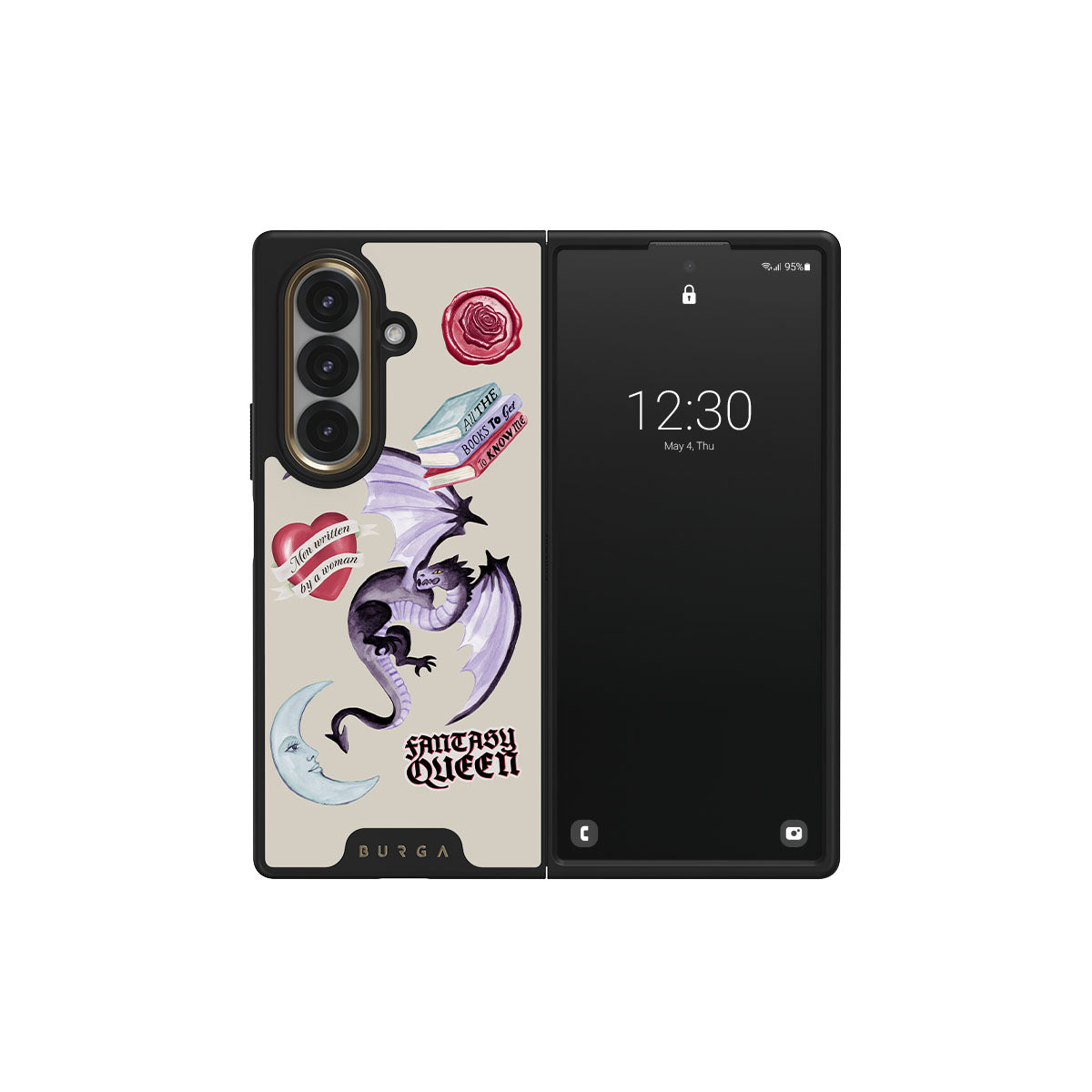 En este diseño: dragón morado, sticker "Fantasy Queen", luna creciente, sello de cera morado, corazón con mensaje, libros.