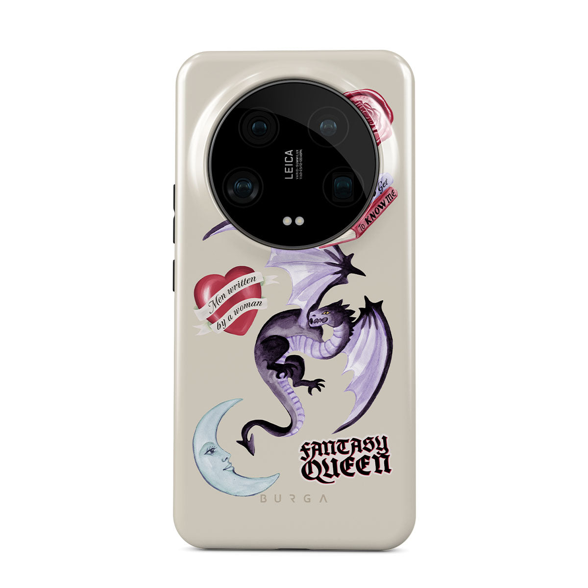 En este diseño: dragón morado, sticker "Fantasy Queen", luna creciente, sello de cera morado, corazón con mensaje, libros.