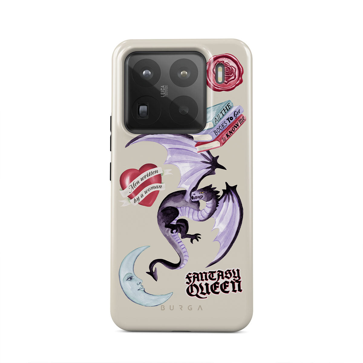 En este diseño: dragón morado, sticker "Fantasy Queen", luna creciente, sello de cera morado, corazón con mensaje, libros.