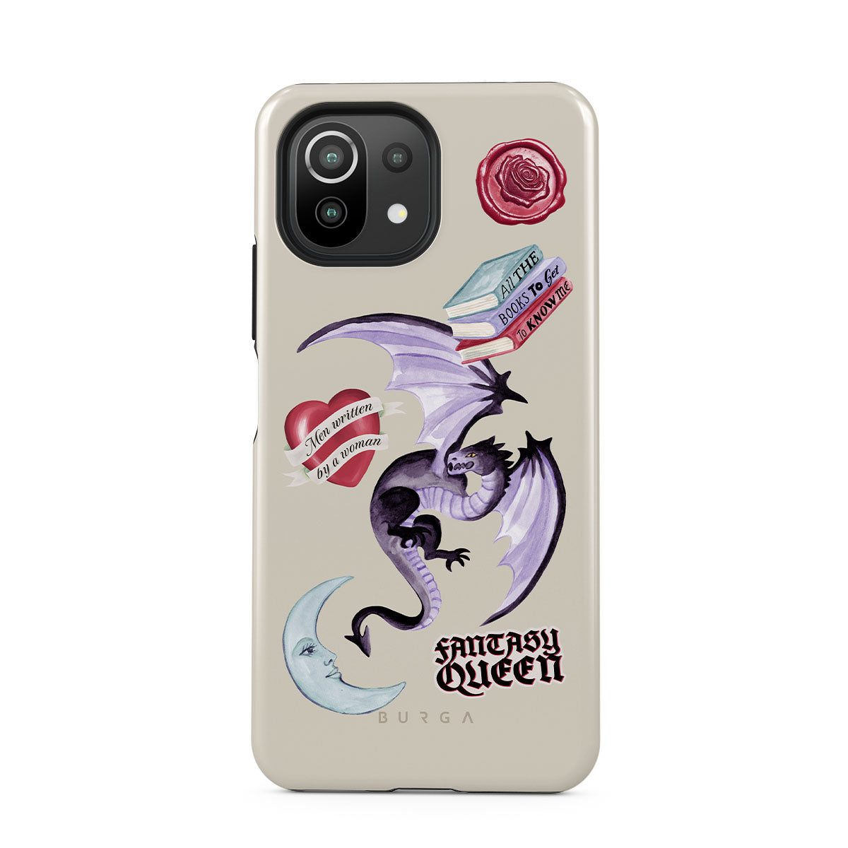 En este diseño: dragón morado, sticker "Fantasy Queen", luna creciente, sello de cera morado, corazón con mensaje, libros.