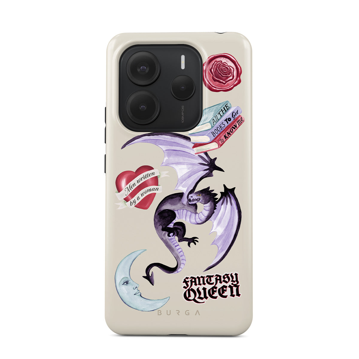 En este diseño: dragón morado, sticker "Fantasy Queen", luna creciente, sello de cera morado, corazón con mensaje, libros.