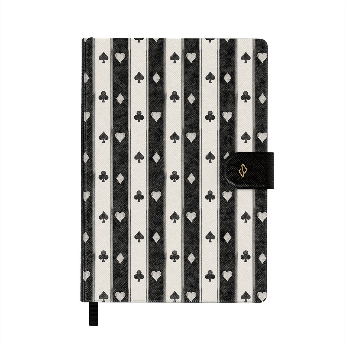 En este diseño: rayas en blanco y negro, corazones, palos de cartas, estilo vintage