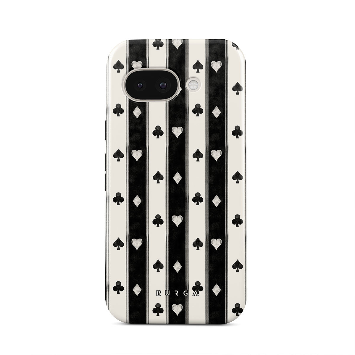 En este diseño: rayas en blanco y negro, corazones, palos de cartas, estilo vintage
