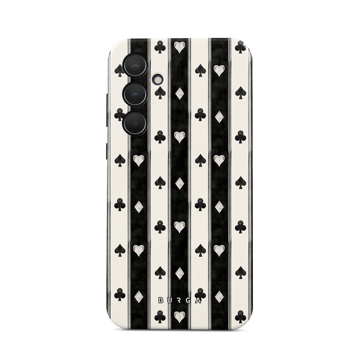 En este diseño: rayas en blanco y negro, corazones, palos de cartas, estilo vintage