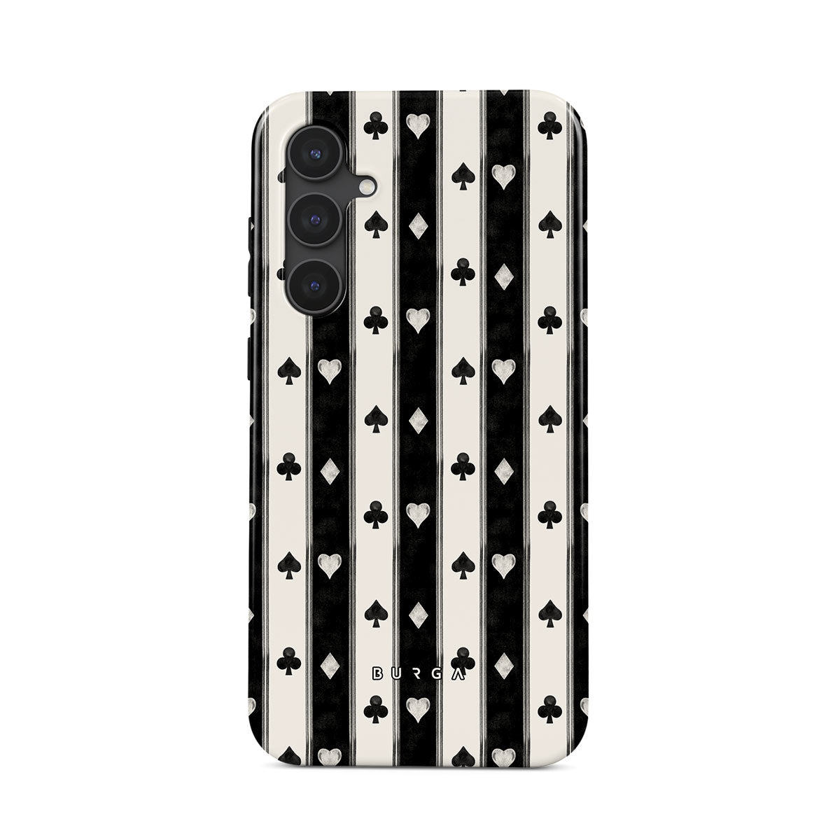 En este diseño: rayas en blanco y negro, corazones, palos de cartas, estilo vintage