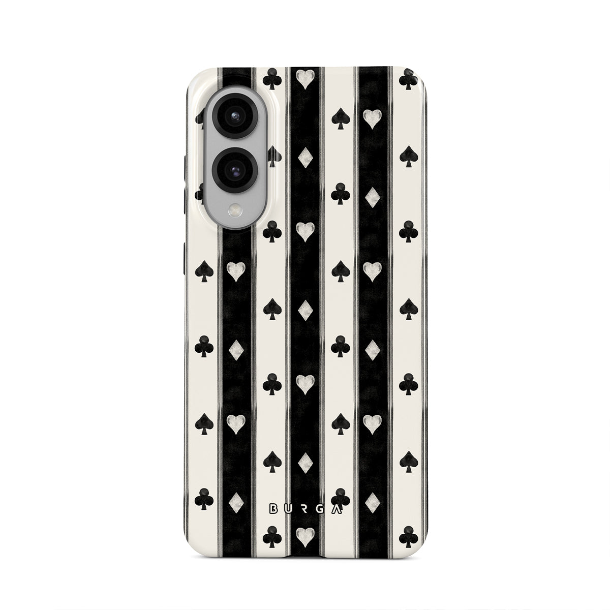 En este diseño: rayas en blanco y negro, corazones, palos de cartas, estilo vintage