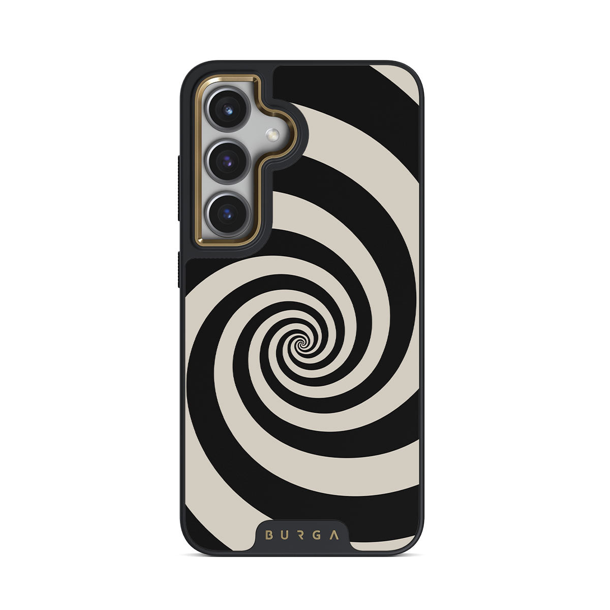 En este diseño: espiral blanco y negro, patrón hipnótico
