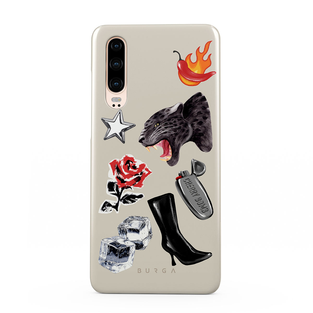 En este diseño: pantera negra, rosa roja, pimiento ardiendo, encendedor plateado, botas negras altas, cubitos de hielo, estrella plateada.