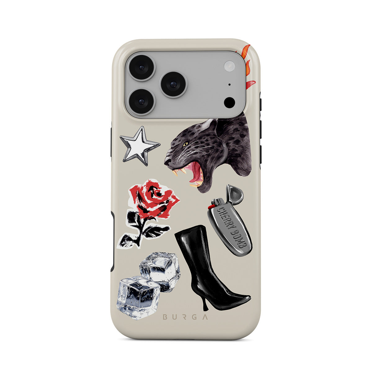 En este diseño: pantera negra, rosa roja, pimiento ardiendo, encendedor plateado, botas negras altas, cubitos de hielo, estrella plateada.