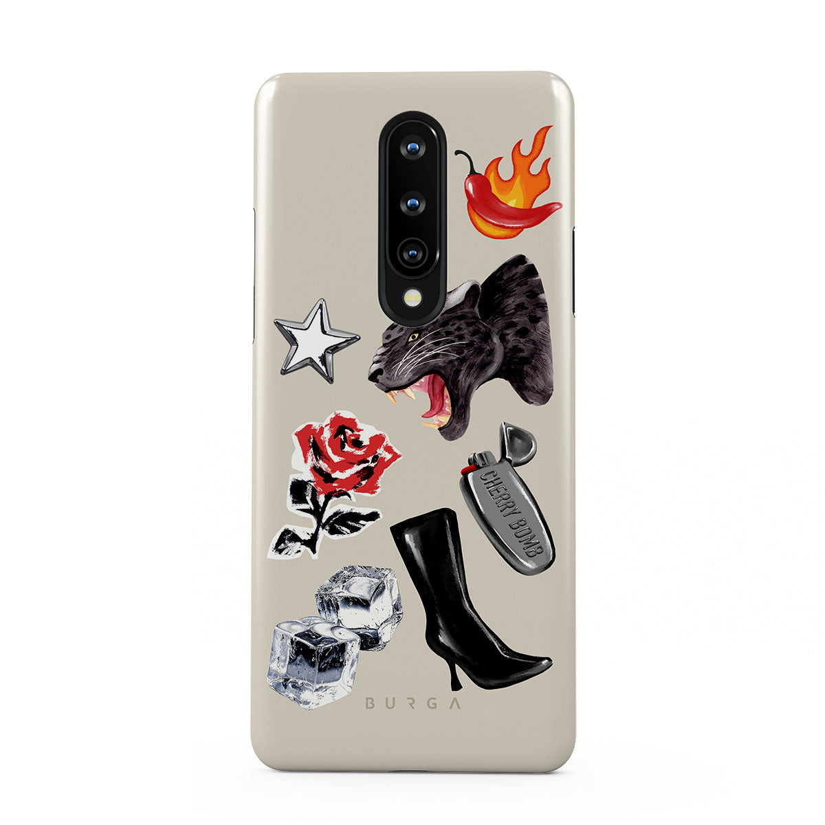 En este diseño: pantera negra, rosa roja, pimiento ardiendo, encendedor plateado, botas negras altas, cubitos de hielo, estrella plateada.