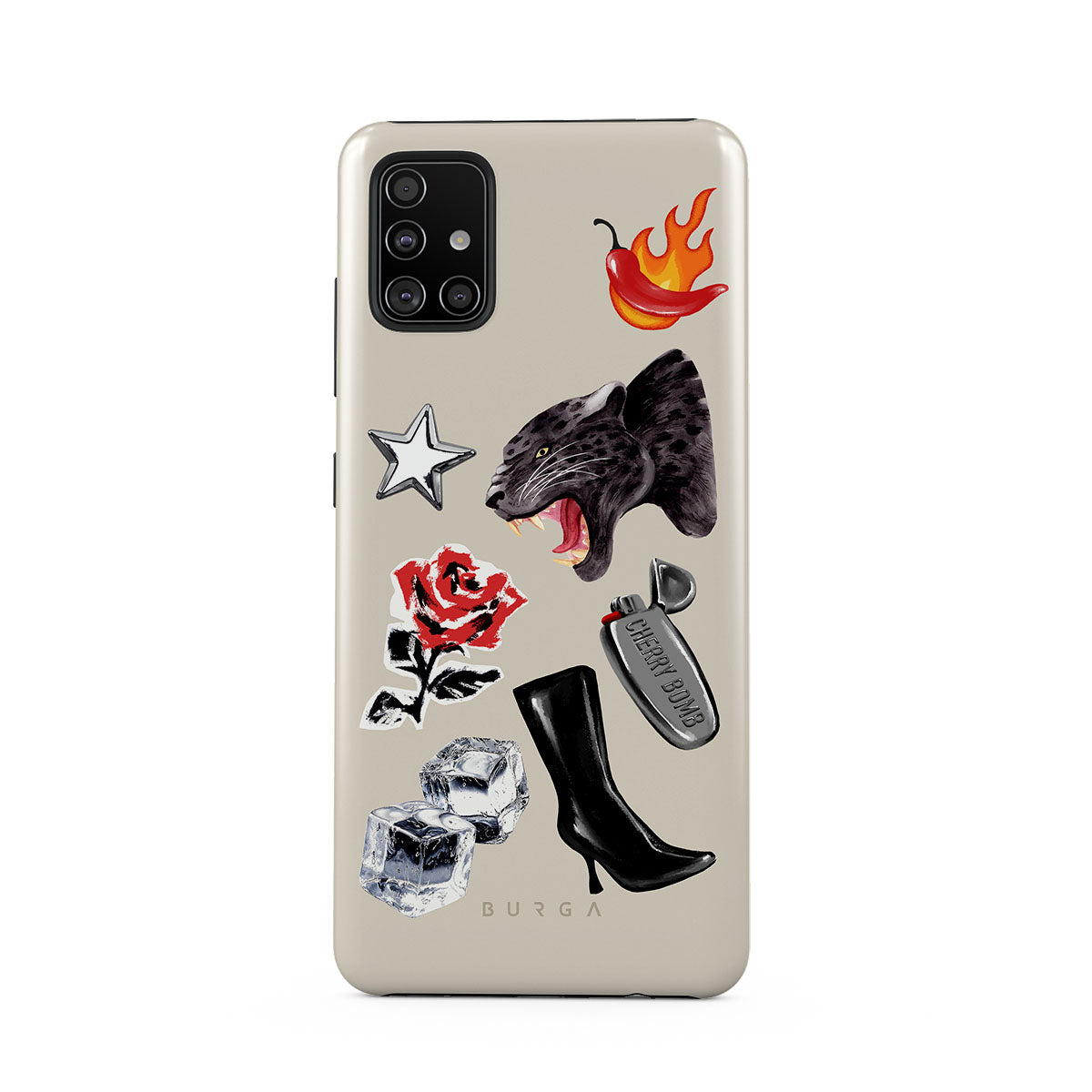 En este diseño: pantera negra, rosa roja, pimiento ardiendo, encendedor plateado, botas negras altas, cubitos de hielo, estrella plateada.