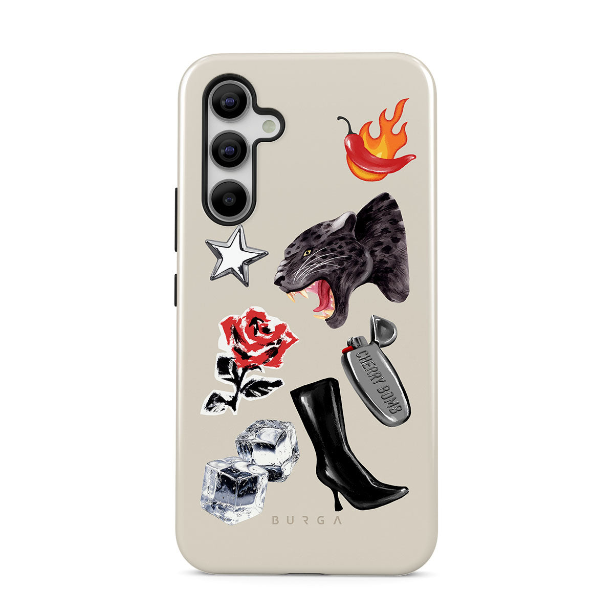 En este diseño: pantera negra, rosa roja, pimiento ardiendo, encendedor plateado, botas negras altas, cubitos de hielo, estrella plateada.