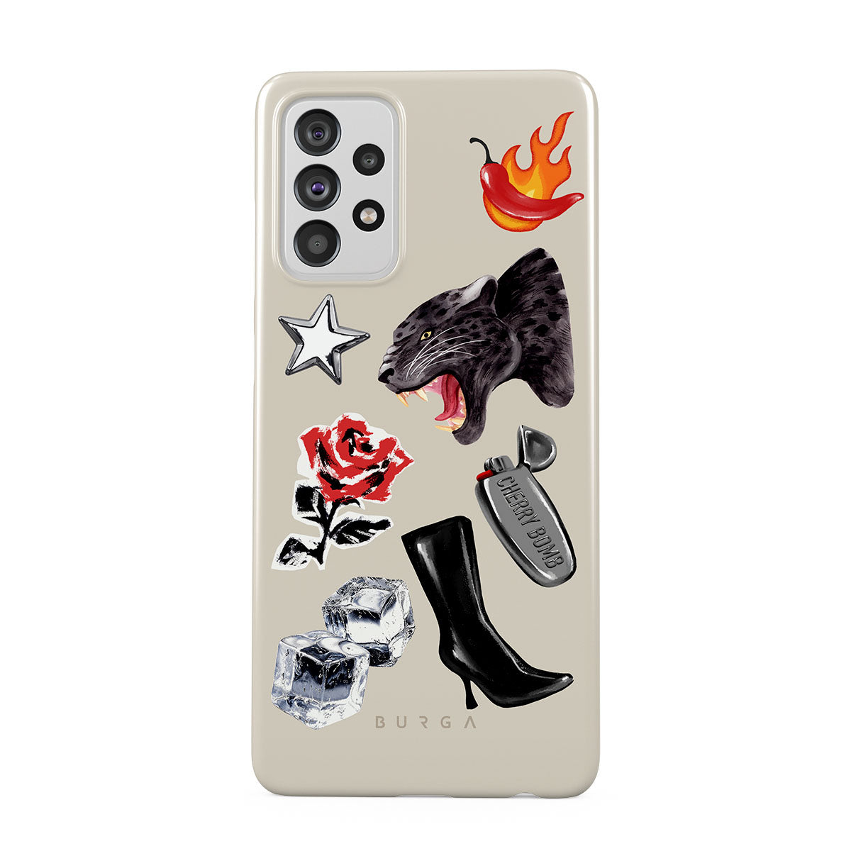 En este diseño: pantera negra, rosa roja, pimiento ardiendo, encendedor plateado, botas negras altas, cubitos de hielo, estrella plateada.