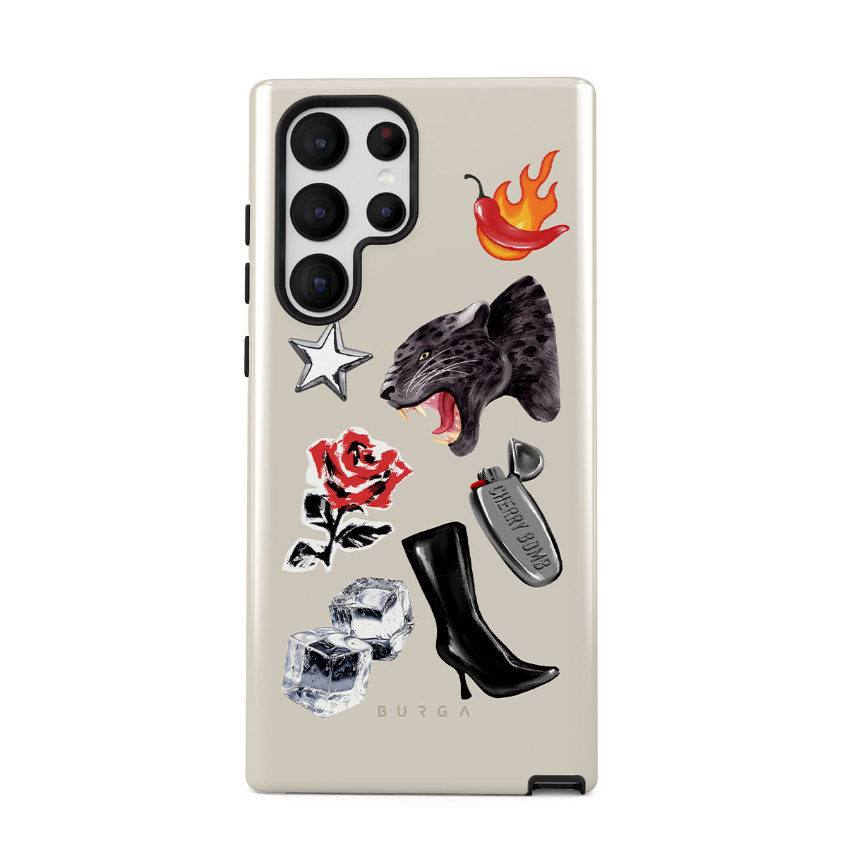 En este diseño: pantera negra, rosa roja, pimiento ardiendo, encendedor plateado, botas negras altas, cubitos de hielo, estrella plateada.