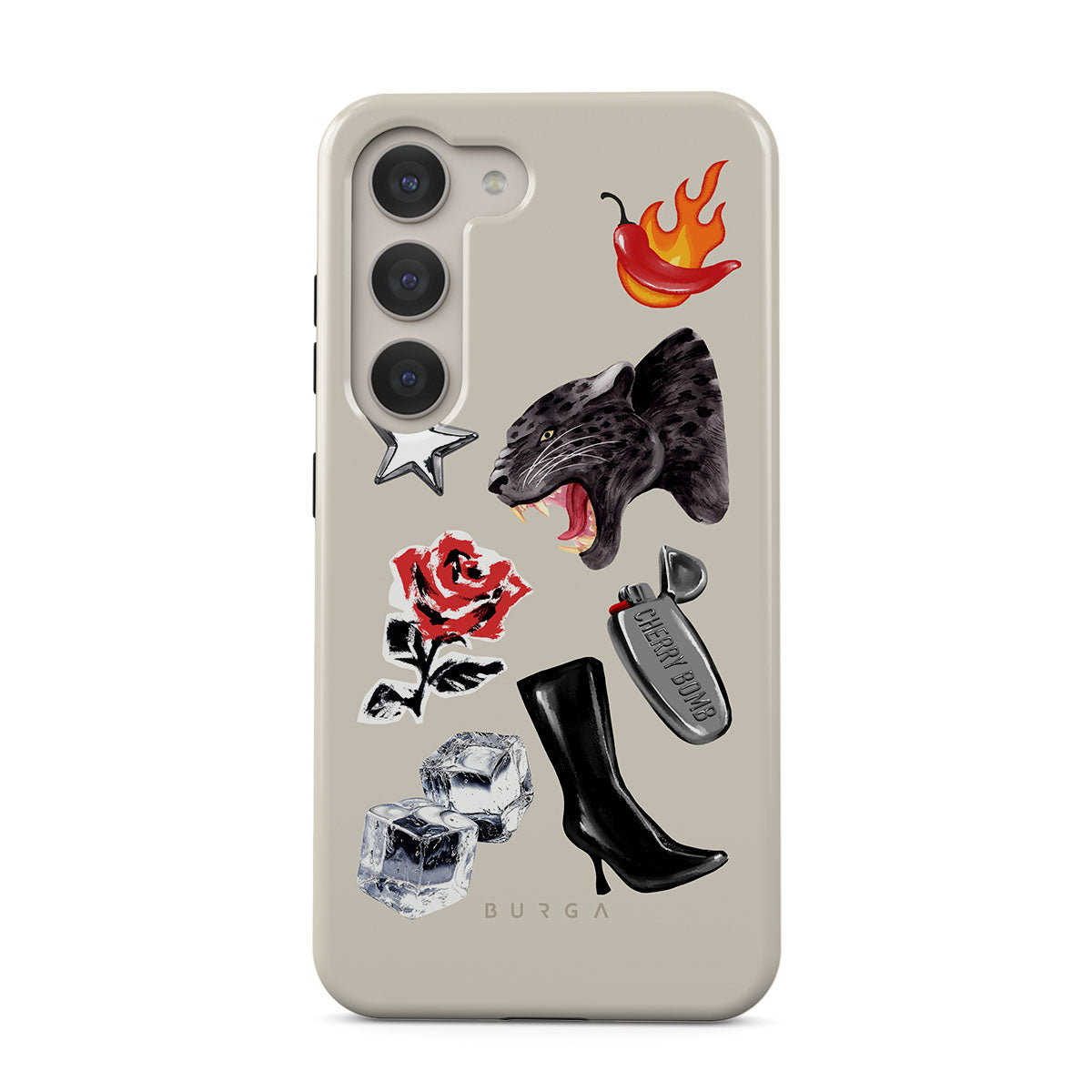 En este diseño: pantera negra, rosa roja, pimiento ardiendo, encendedor plateado, botas negras altas, cubitos de hielo, estrella plateada.