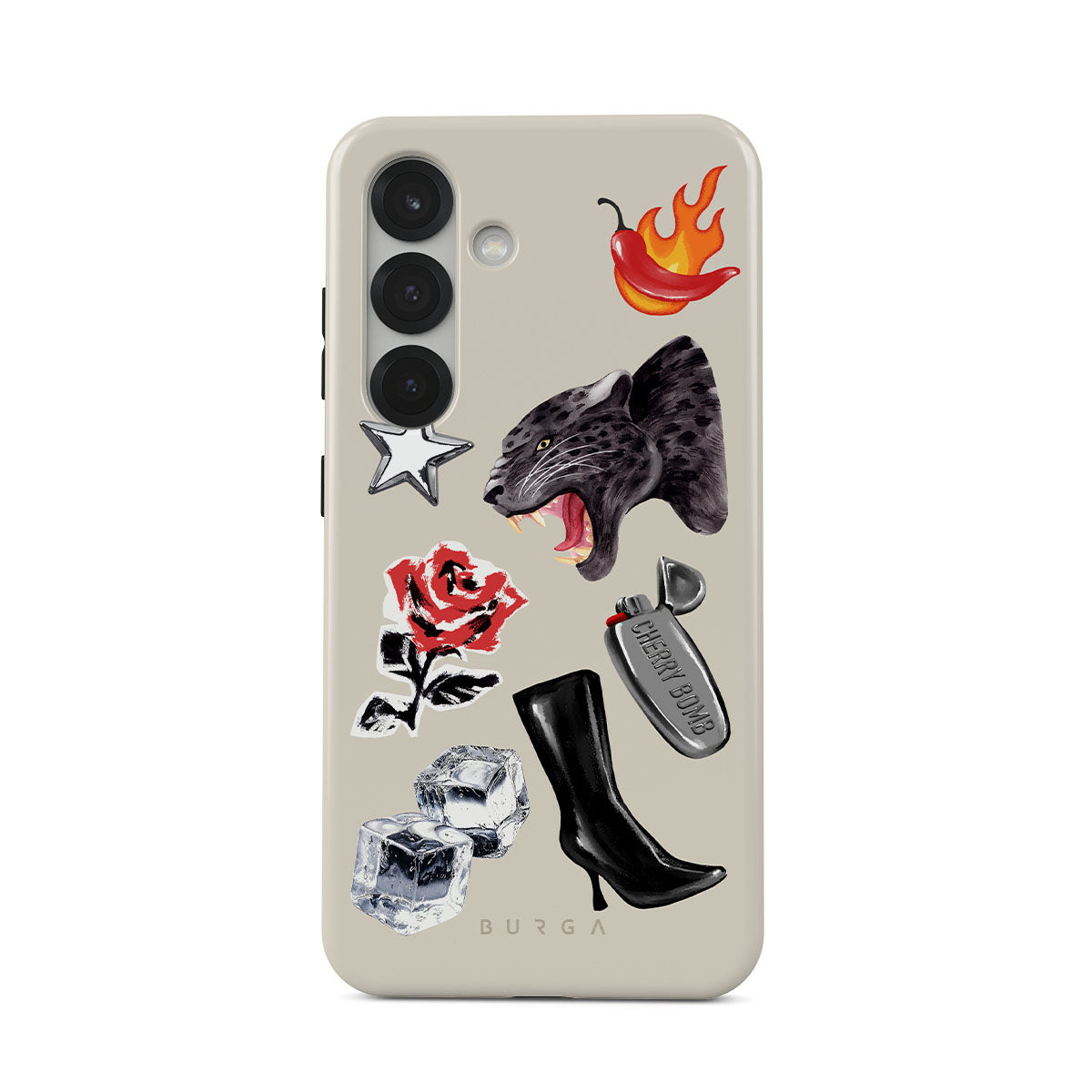 En este diseño: pantera negra, rosa roja, pimiento ardiendo, encendedor plateado, botas negras altas, cubitos de hielo, estrella plateada.