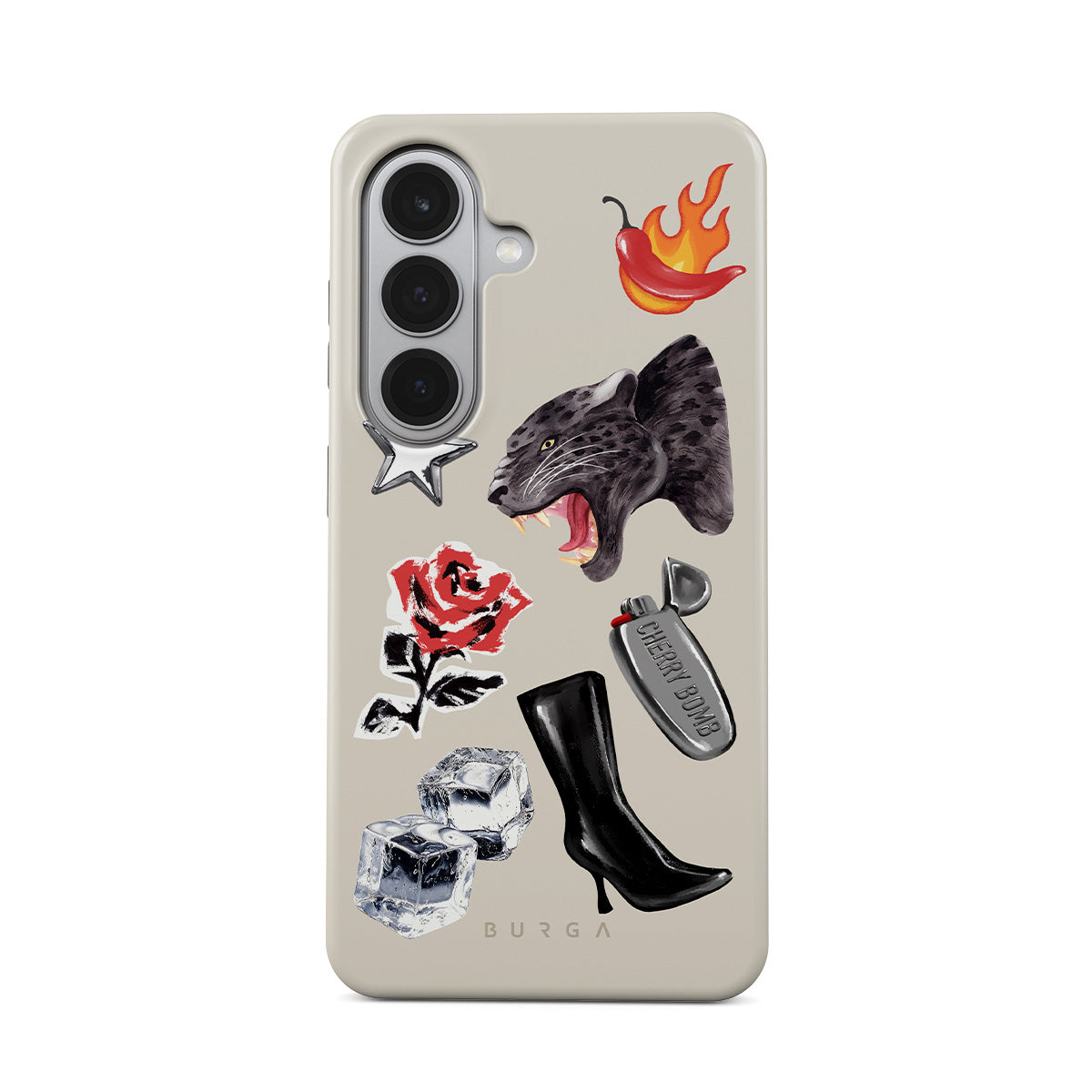 En este diseño: pantera negra, rosa roja, pimiento ardiendo, encendedor plateado, botas negras altas, cubitos de hielo, estrella plateada.