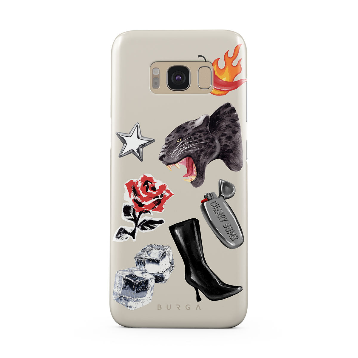 En este diseño: pantera negra, rosa roja, pimiento ardiendo, encendedor plateado, botas negras altas, cubitos de hielo, estrella plateada.