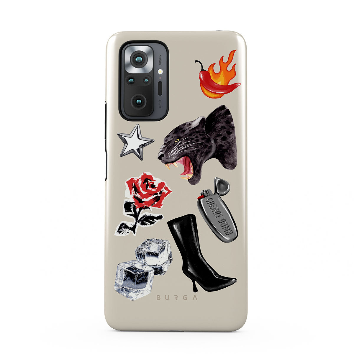 En este diseño: pantera negra, rosa roja, pimiento ardiendo, encendedor plateado, botas negras altas, cubitos de hielo, estrella plateada.