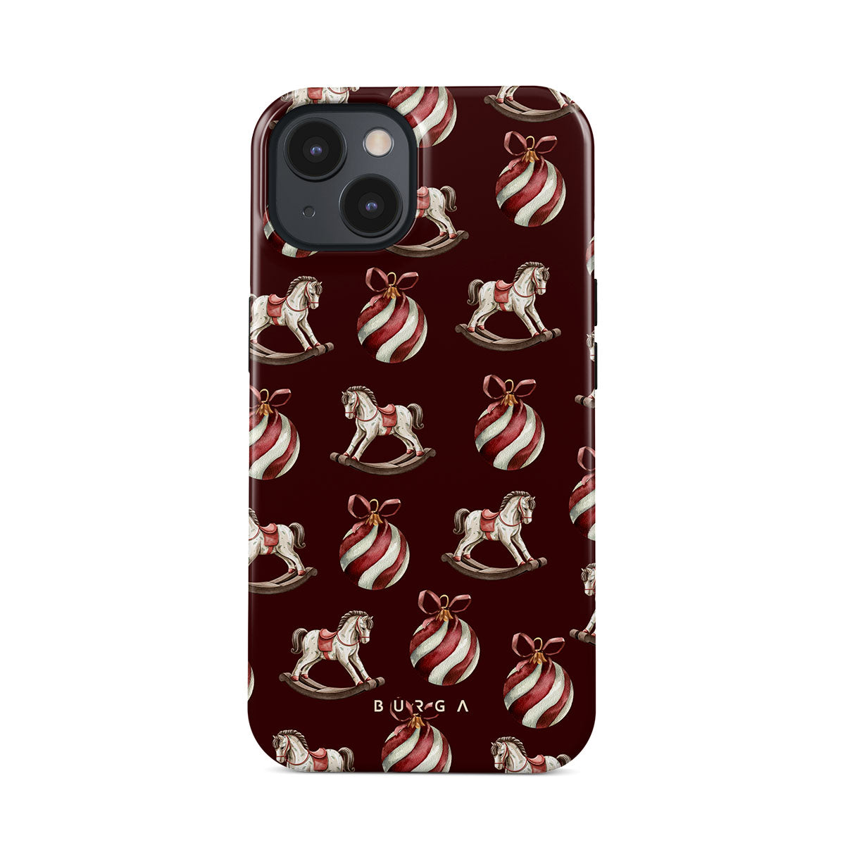 El diseño presenta: caballitos balancín, bolas de Navidad, rojo, decoración navideña