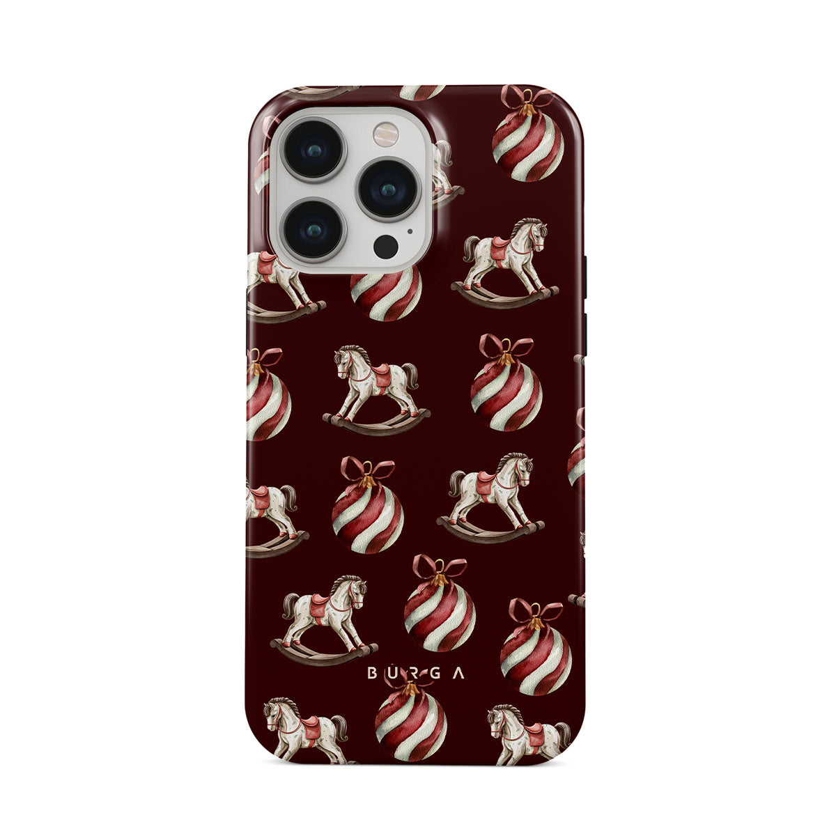 El diseño presenta: caballitos balancín, bolas de Navidad, rojo, decoración navideña