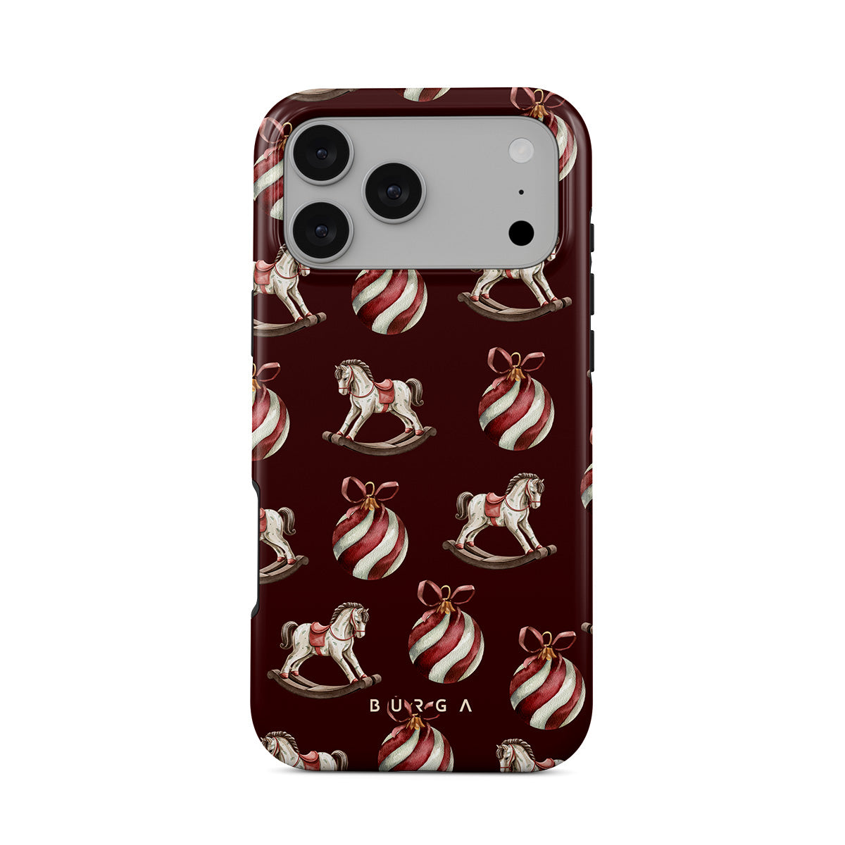 El diseño presenta: caballitos balancín, bolas de Navidad, rojo, decoración navideña