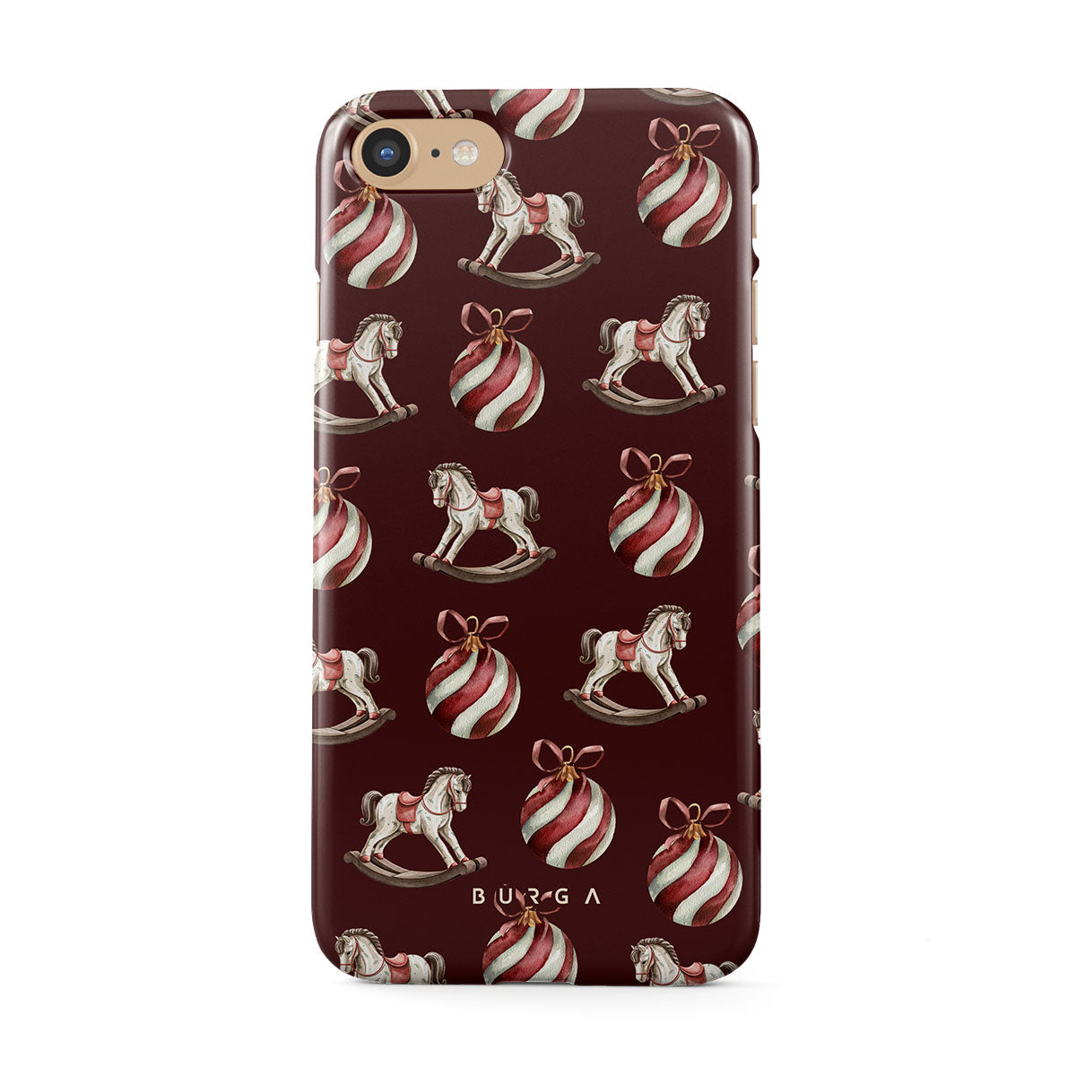 El diseño presenta: caballitos balancín, bolas de Navidad, rojo, decoración navideña