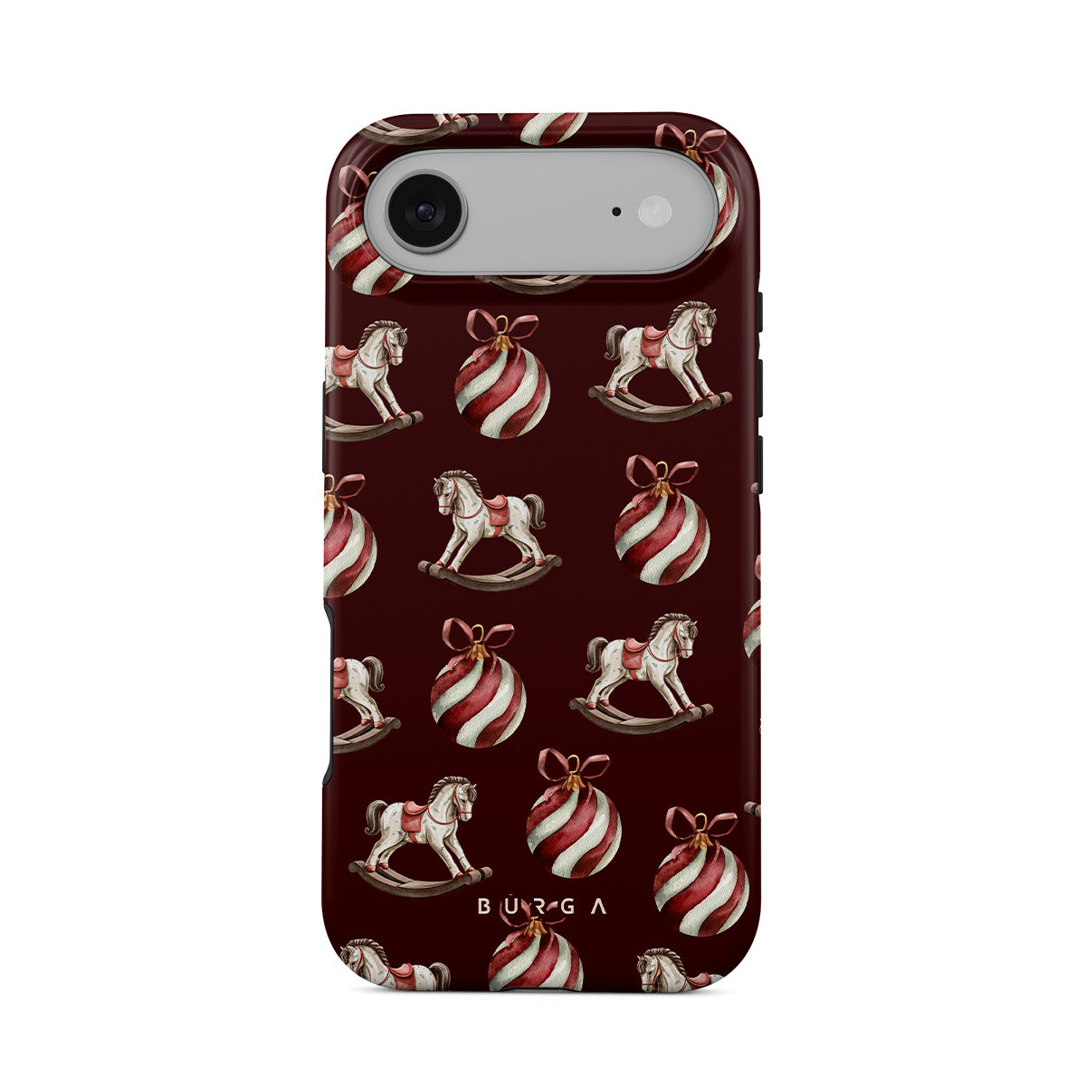 El diseño presenta: caballitos balancín, bolas de Navidad, rojo, decoración navideña