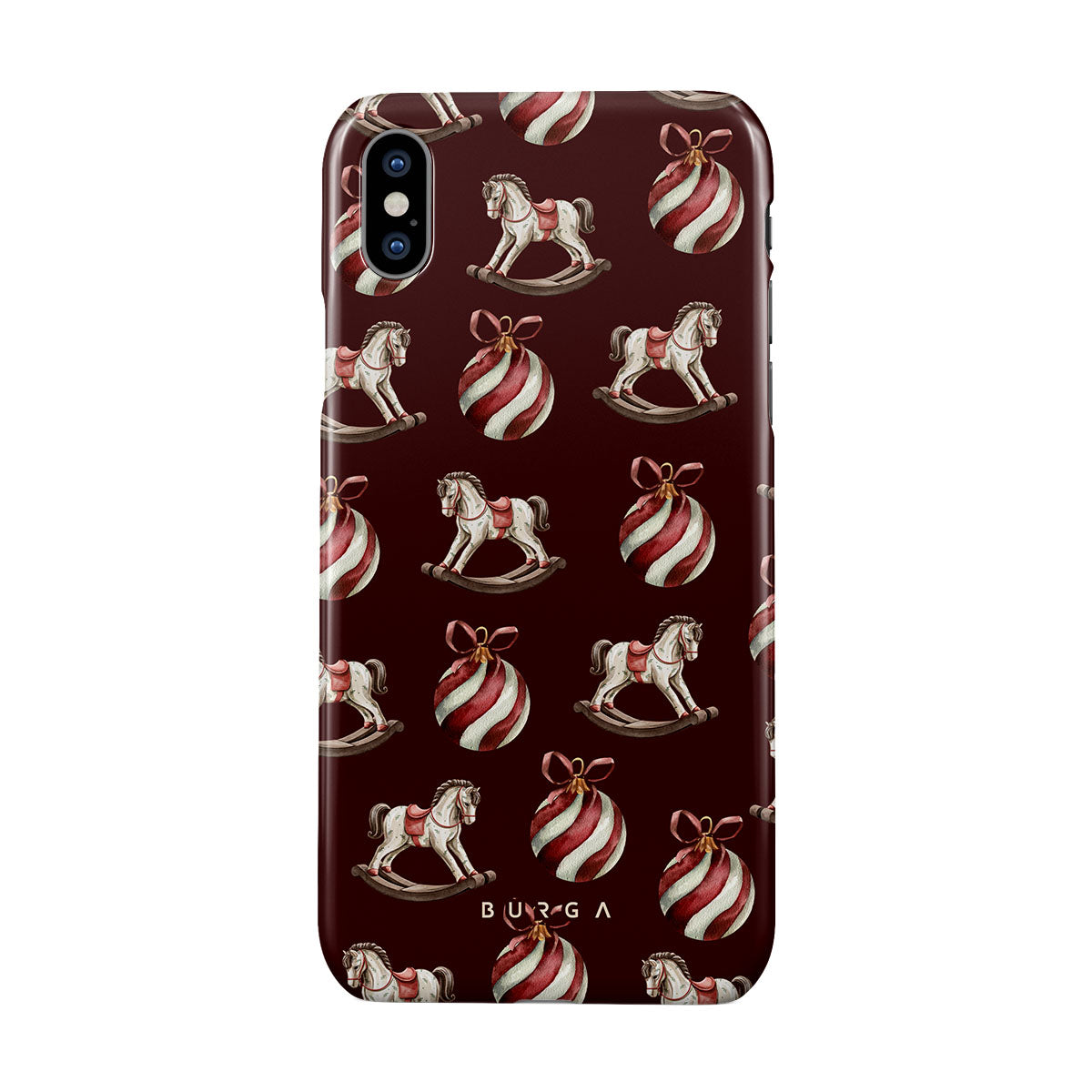 El diseño presenta: caballitos balancín, bolas de Navidad, rojo, decoración navideña