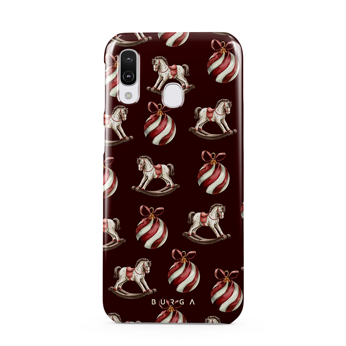 El diseño presenta: caballitos balancín, bolas de Navidad, rojo, decoración navideña